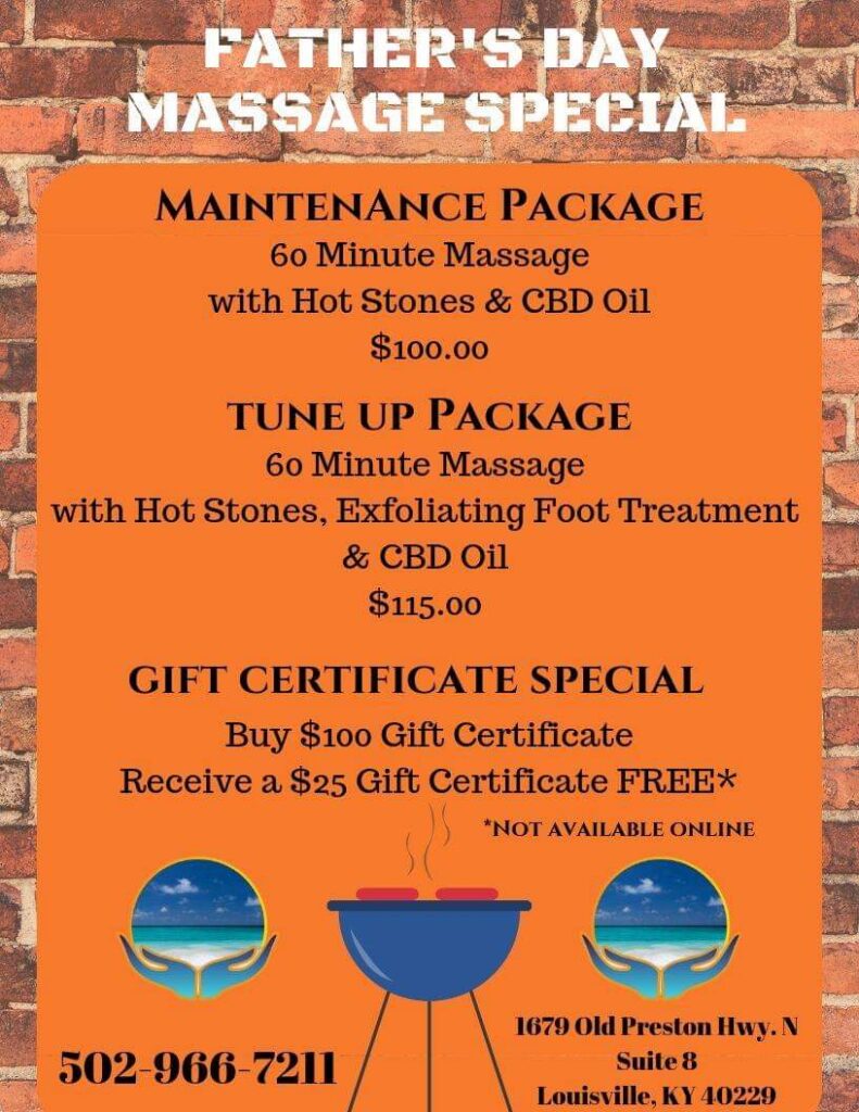 For all the fantastic fathers; enjoy a revitalizing session at a special discounted rate! Per the price sheet above, BOOK ONLINE (select Services, choose from the two Father’s Day Specials) and schedule him an amazing treat he’ll always cherish!
