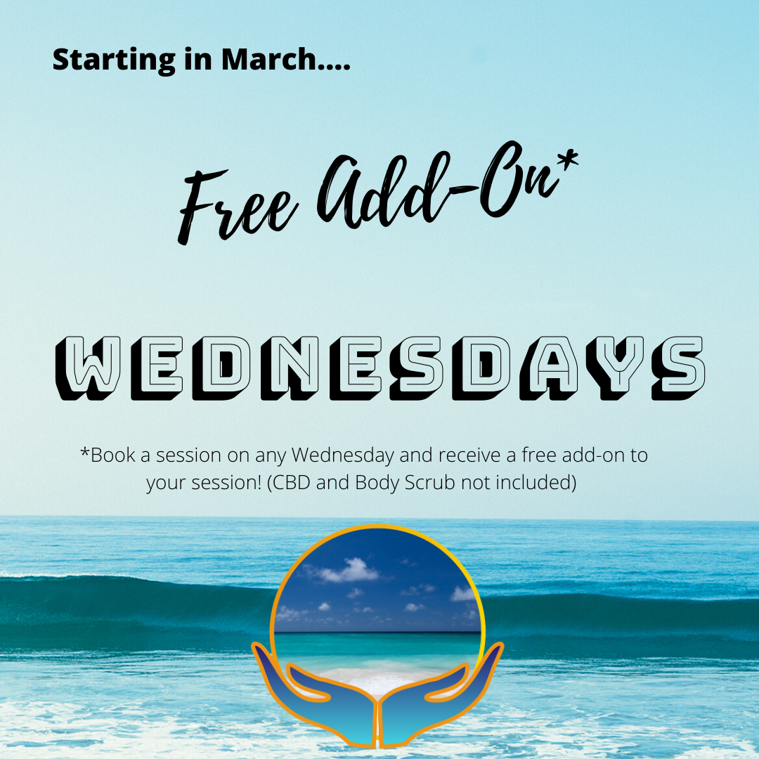 Beginning March 4, 2020, every Wednesday you can receive a free add-on to your session! That’s right! As Sea of Tranquility celebrate our one year anniversary, we want to thank our awesome clients for making this first year successful.