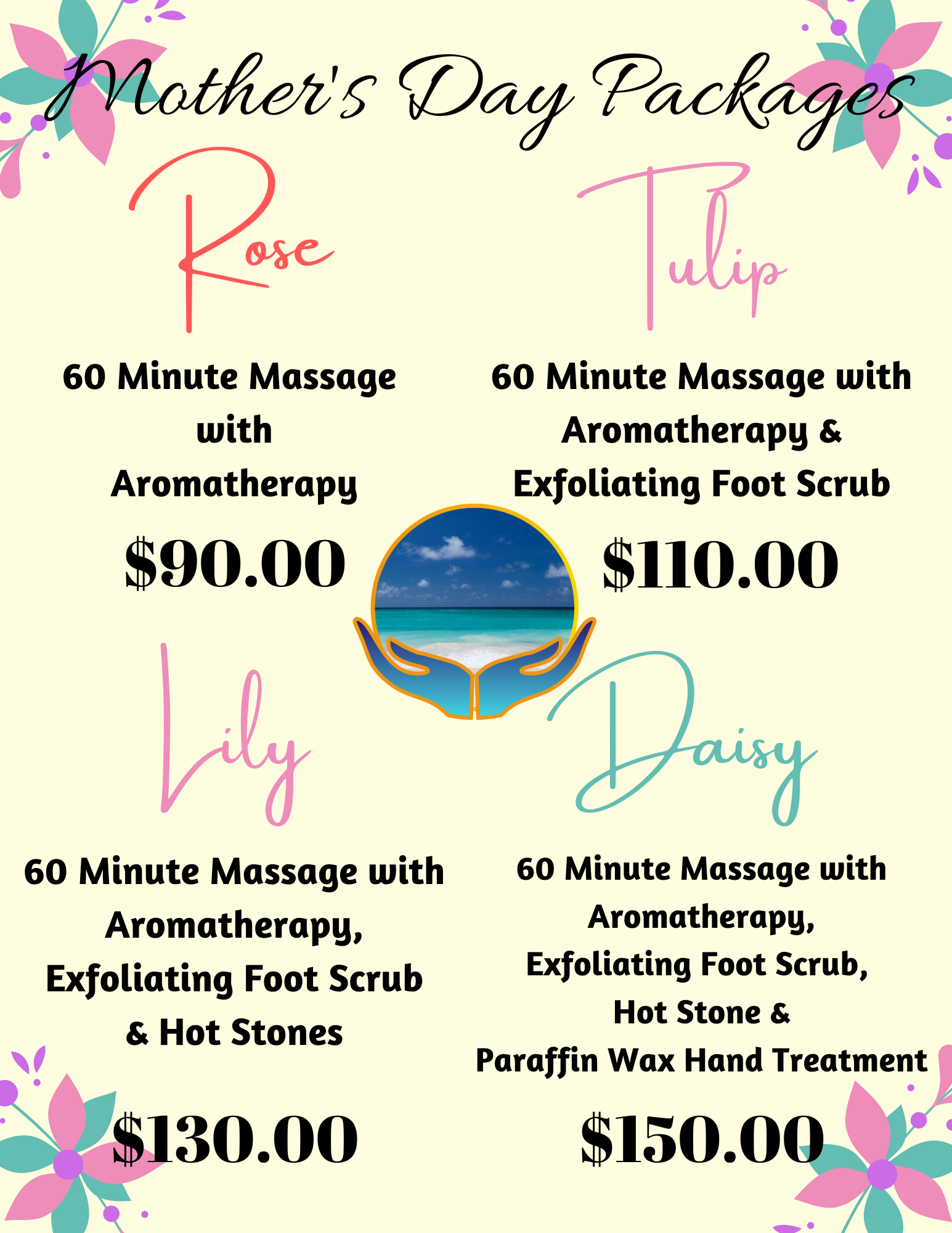 Mother’s Day is right around the corner! We have our special packages readily available for the woman you love! Gift certificates available as well. Make her smile on her special day with a massage!