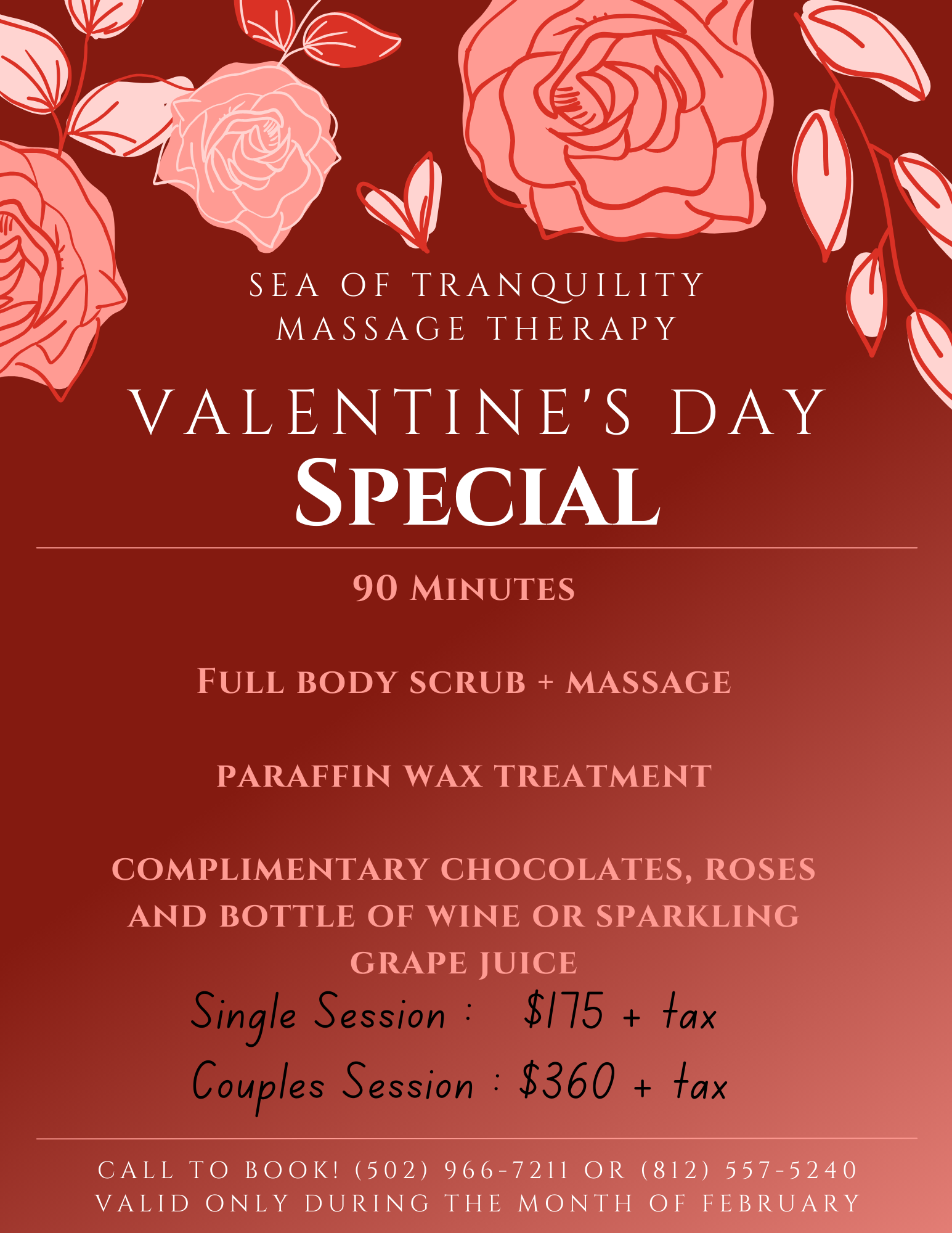 During the whole month of February we are offering a 90-minute body scrub AND massage together with a paraffin wax treatment! *AND* at the end of your session you will receive a complimentary gift bag filled with chocolates, roses AND your choice of a bottle of wine or sparkling grape juice! 🍫🌹🍷❤️