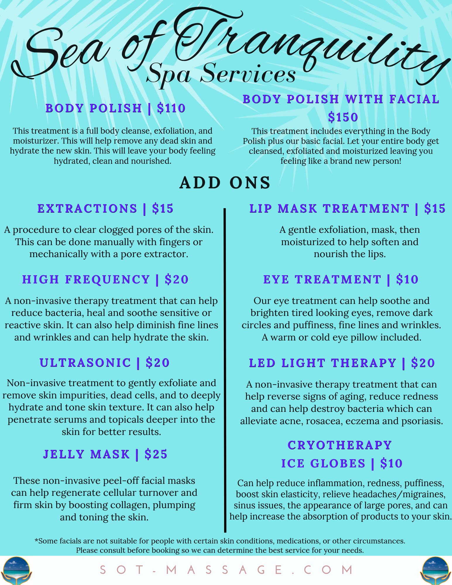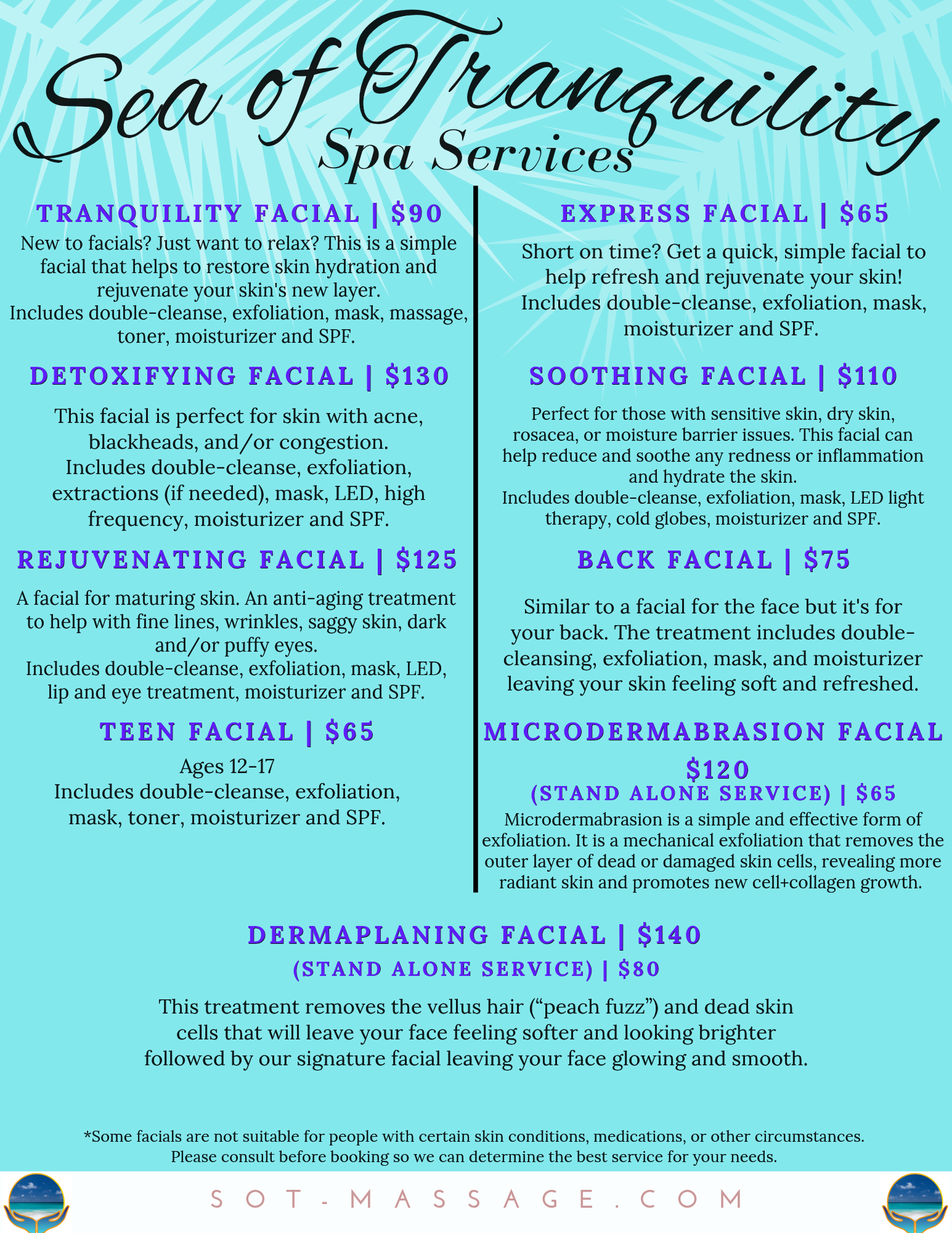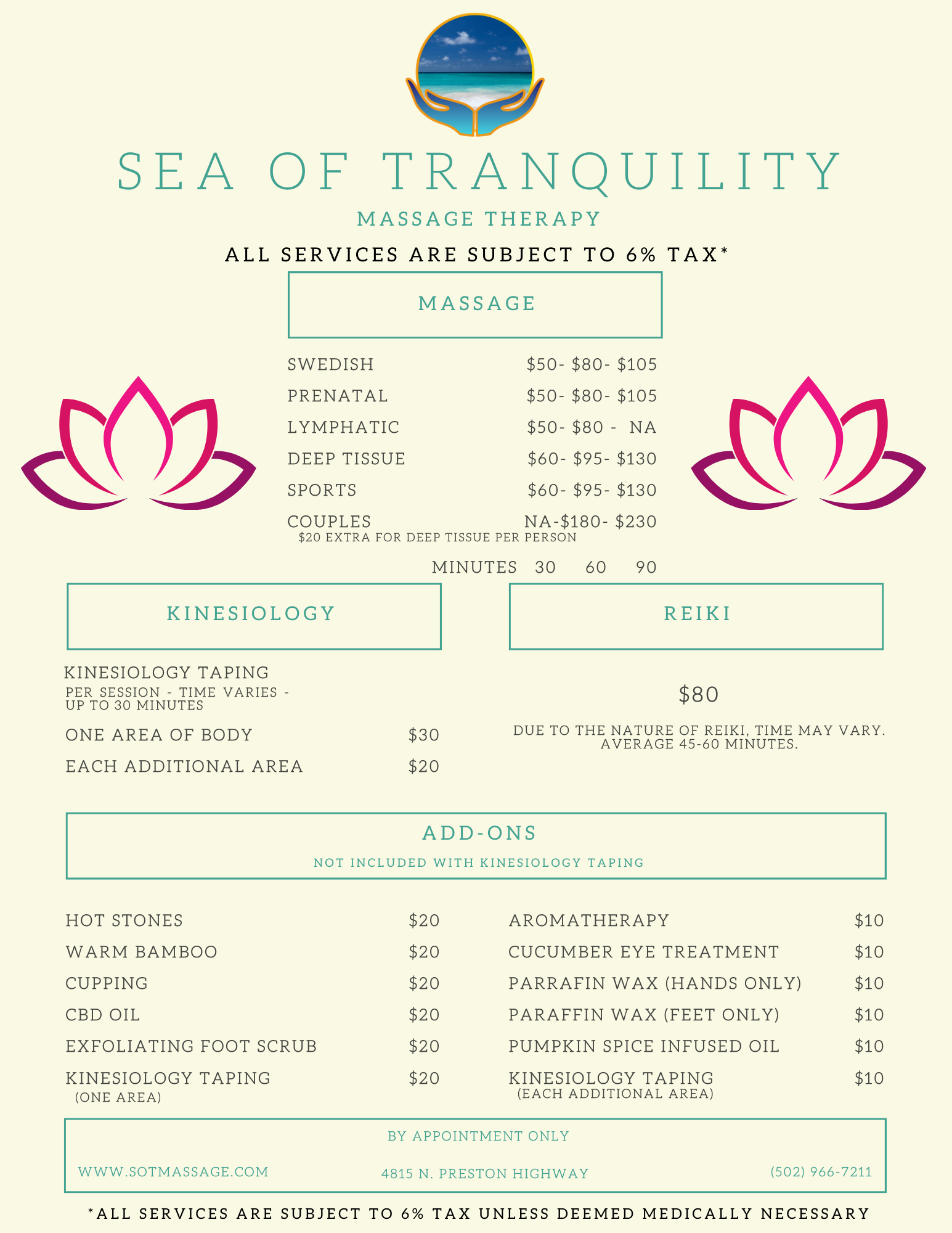 At Sea of Tranquility, our mission is to help every person who walks through our door to the fullest extent of our professional education and unique expertise. We listen and customize each and every session to our clients needs. Your health, wellness, and satisfaction are our primary focus.